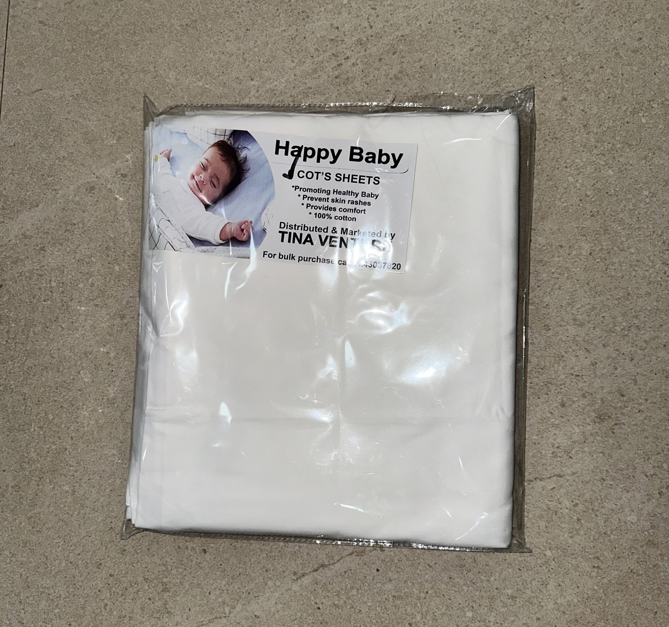 A set contains 5 cotton white cot sheets. 4 cot sheets are 1 yard each and 1 cot sheet is 2 yards. It can be used to back the baby. The trimmings at the edges are white.