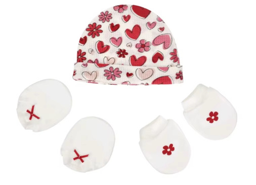 1 piece of Quality cotton hat, a pair of mittens and a pair of booties.